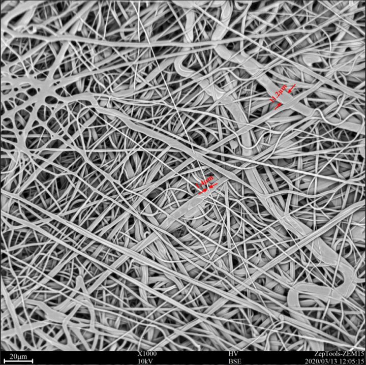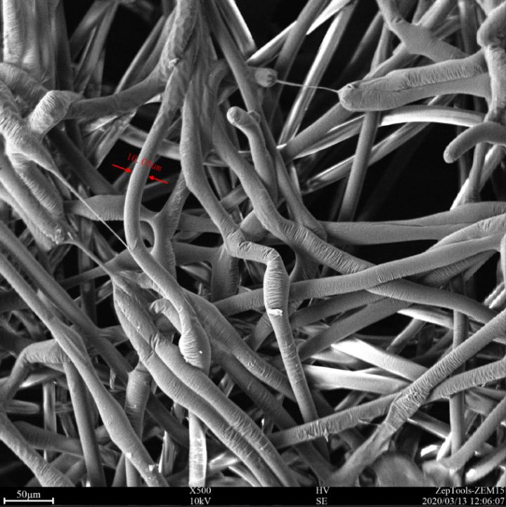 圖3 醫(yī)用外科口罩2中間過濾層(熔噴布層)的掃描電鏡照片。可以看到該層密集排布著1 - 15 um的纖維結(jié)構(gòu)。