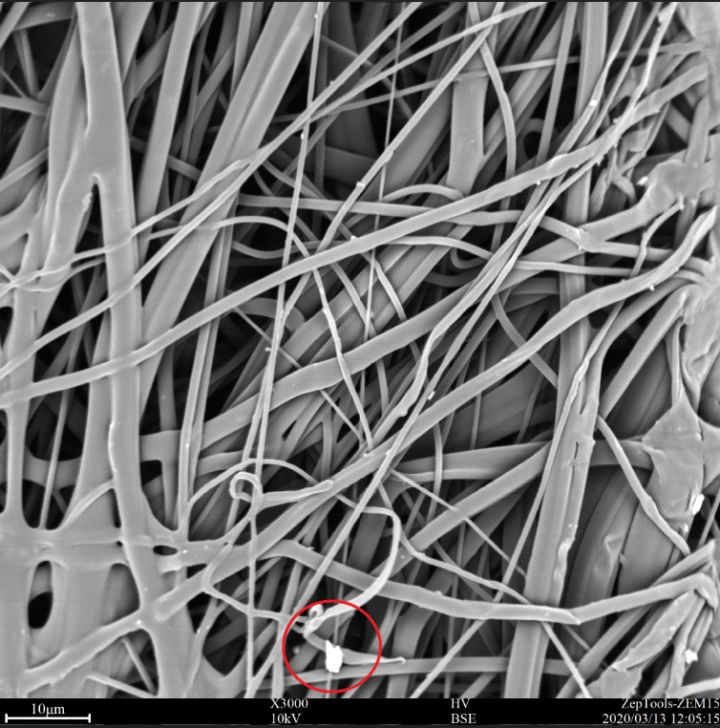 圖4 累計使用過4小時的醫(yī)用外科口罩3的中間過濾層(熔噴布層)。纖維結(jié)構(gòu)排布和前兩種類似,同時發(fā)現(xiàn)直徑3-4 um的顆粒物。