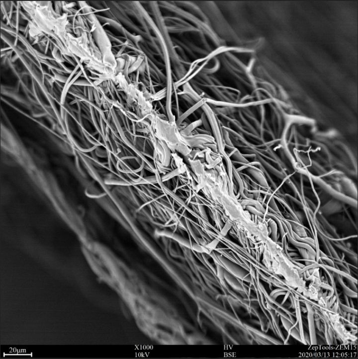 圖6 醫(yī)用口罩中間過濾層(熔噴布)截面的掃描電鏡圖。從截面看纖維排布致密,中間有一道明顯的壓印痕跡,是口罩生產(chǎn)過程中壓制導(dǎo)致的。